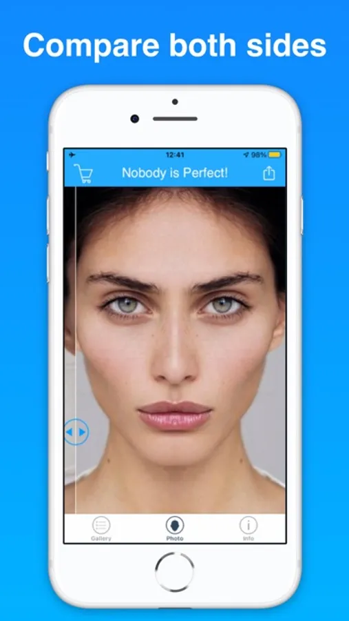 - MINIMAL GUI: tap twice on the screen to take photos, move the arrows with your fingers to see the right and left side of your face.