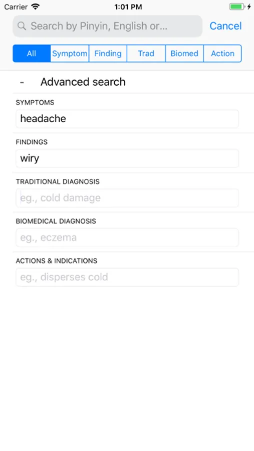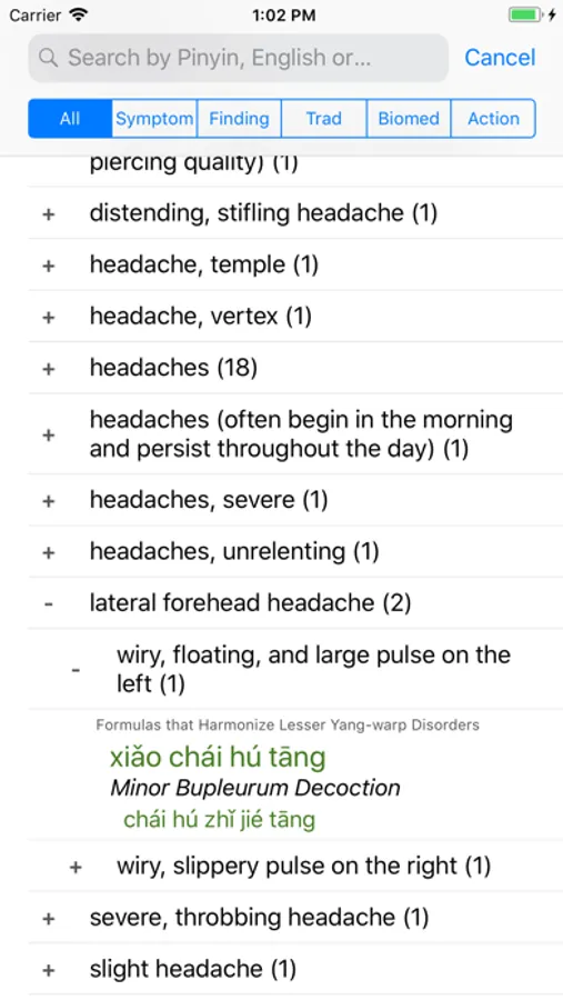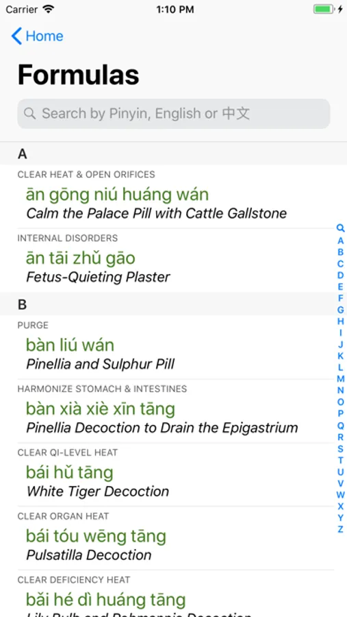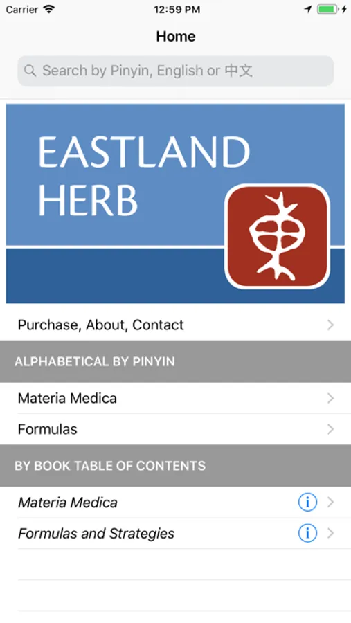 • Herbs and formulas are searchable by English, pinyin, or Chinese name.