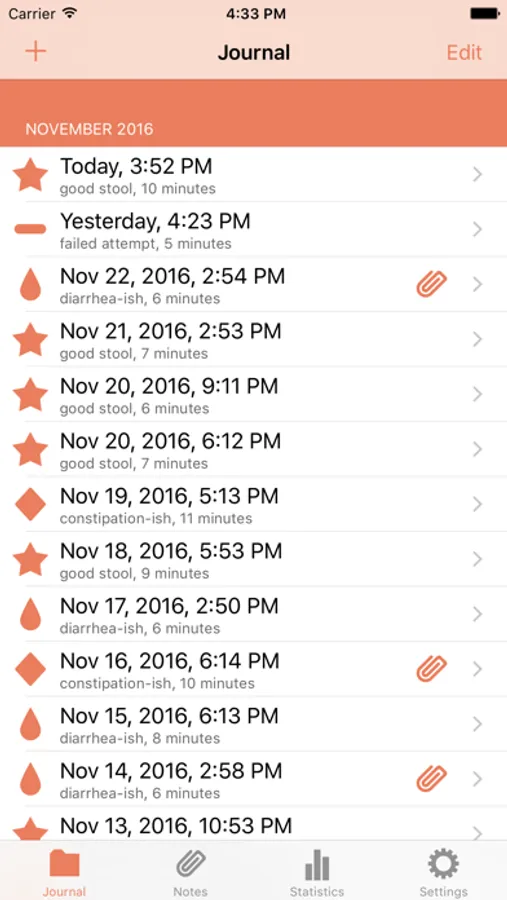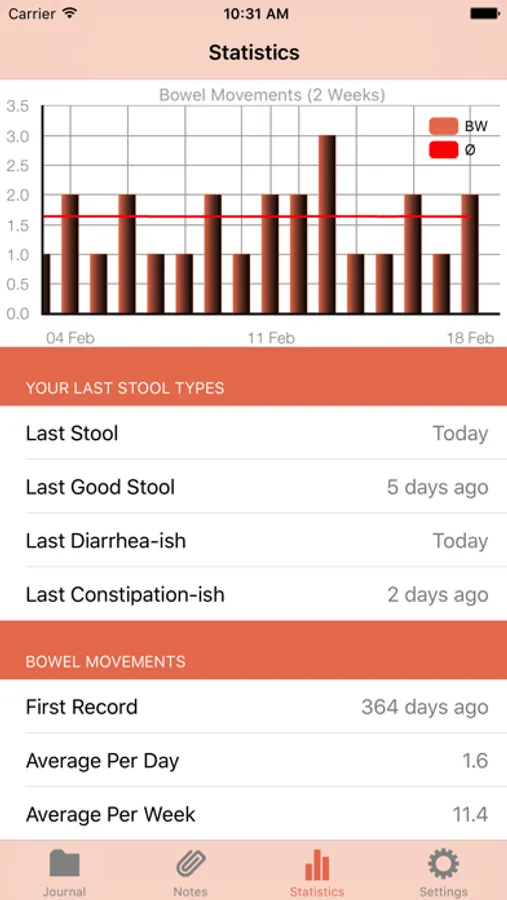 This app makes it very easy to log your bowel movements. You can classify your stool with help of the bristol stool scale and it will calculate a lot of interesting statistics for you.