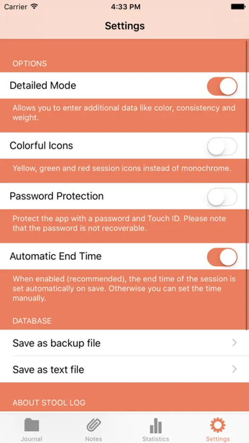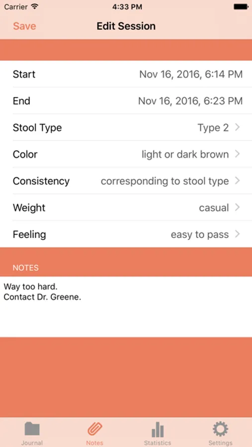 There are two modes: in the simple mode you can log start time (will be set automatically on start), end time (will be set automatically as well), and the stool type according to the bristol stool scale. In the detailed mode you can log additional color, consisteny, weight/volume and your feeling.