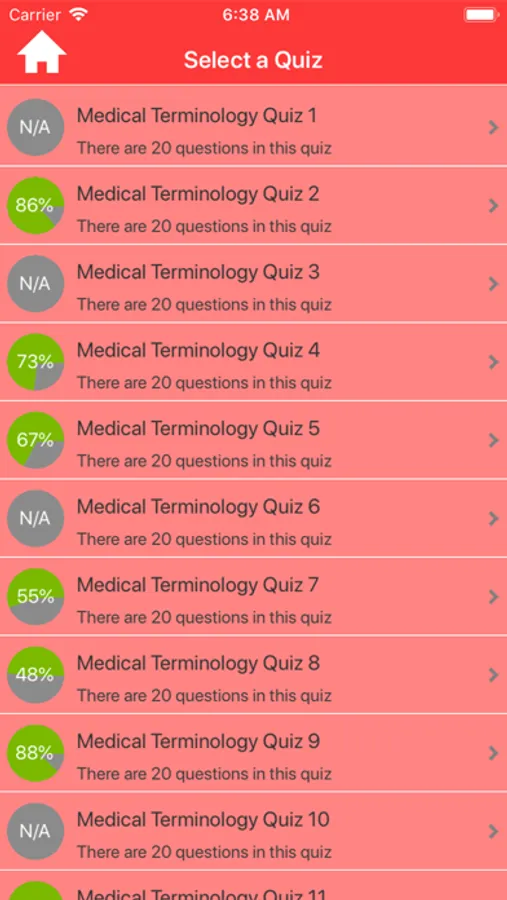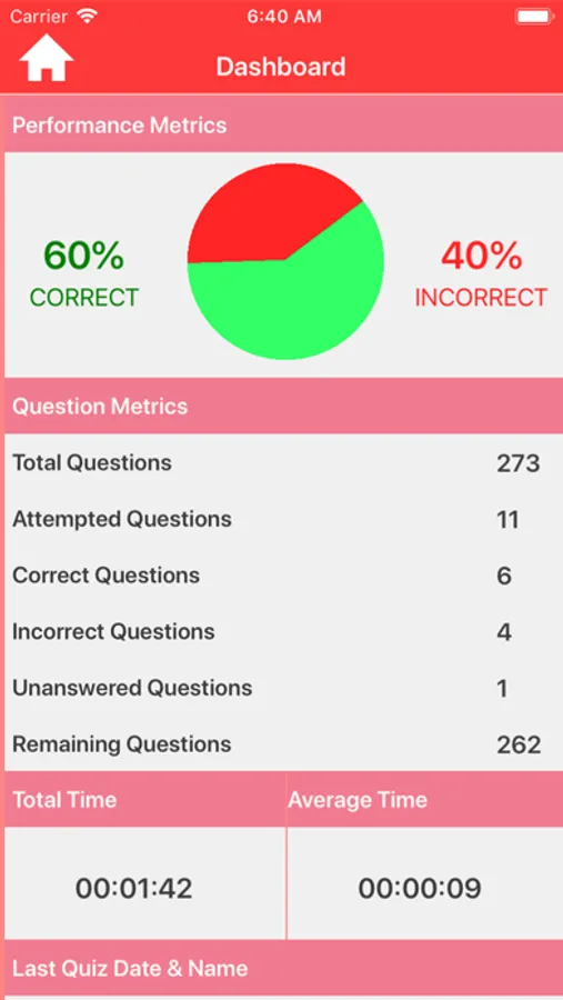 - You can review a quiz session performance details by selected a session. This screen shows quiz history performance reports.