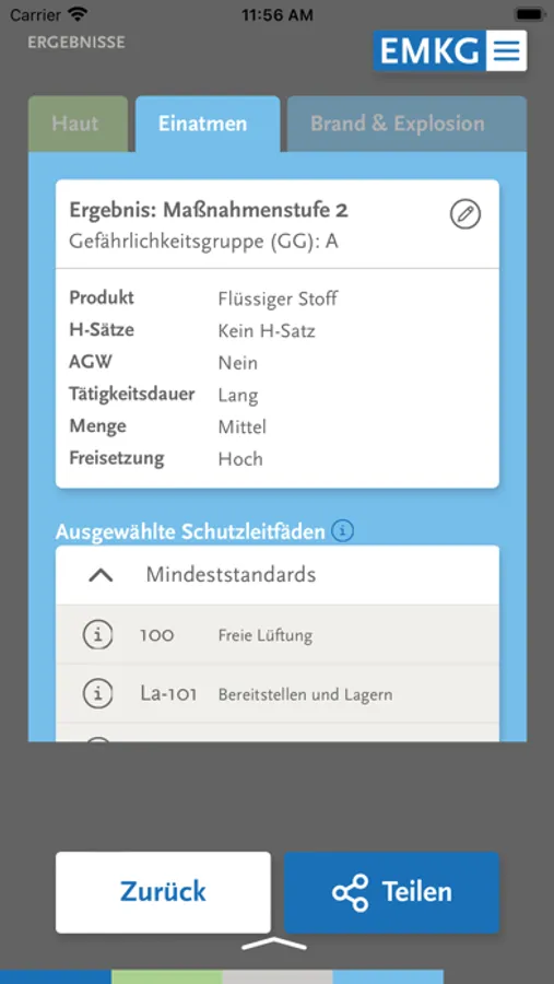 Mit der neuen EMKG Kompakt App (Version 2.2.1) können Sie jetzt neben den Gesundheitsgefährdungen durch Einatmen und Hautkontakt auch Brand- und Explosionsgefährdungen beurteilen.