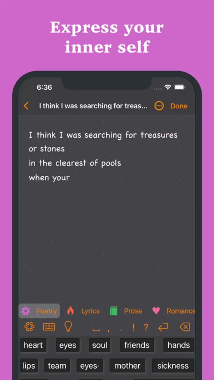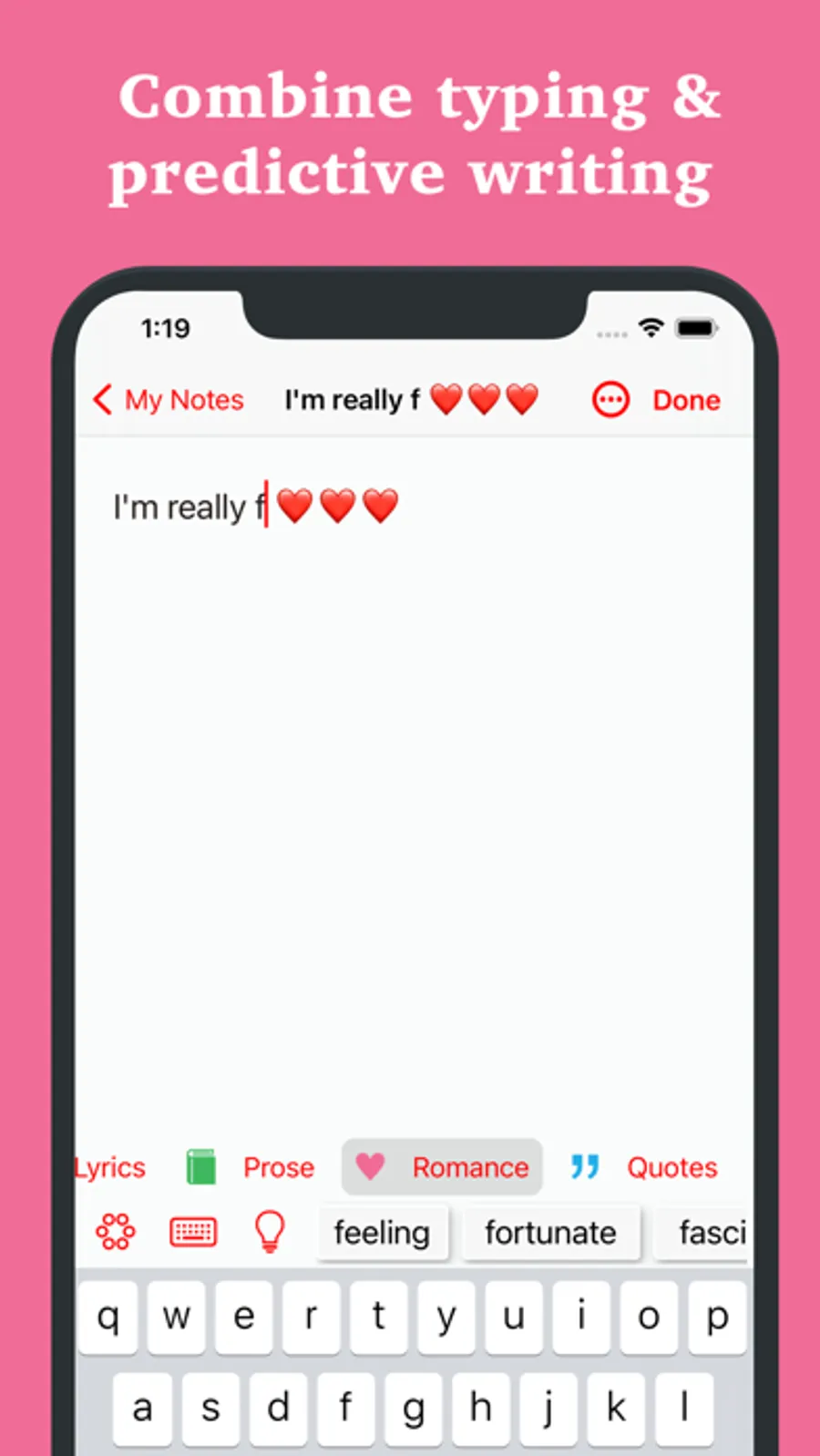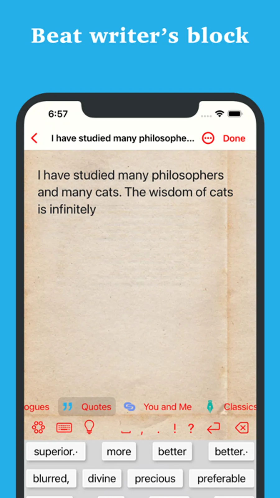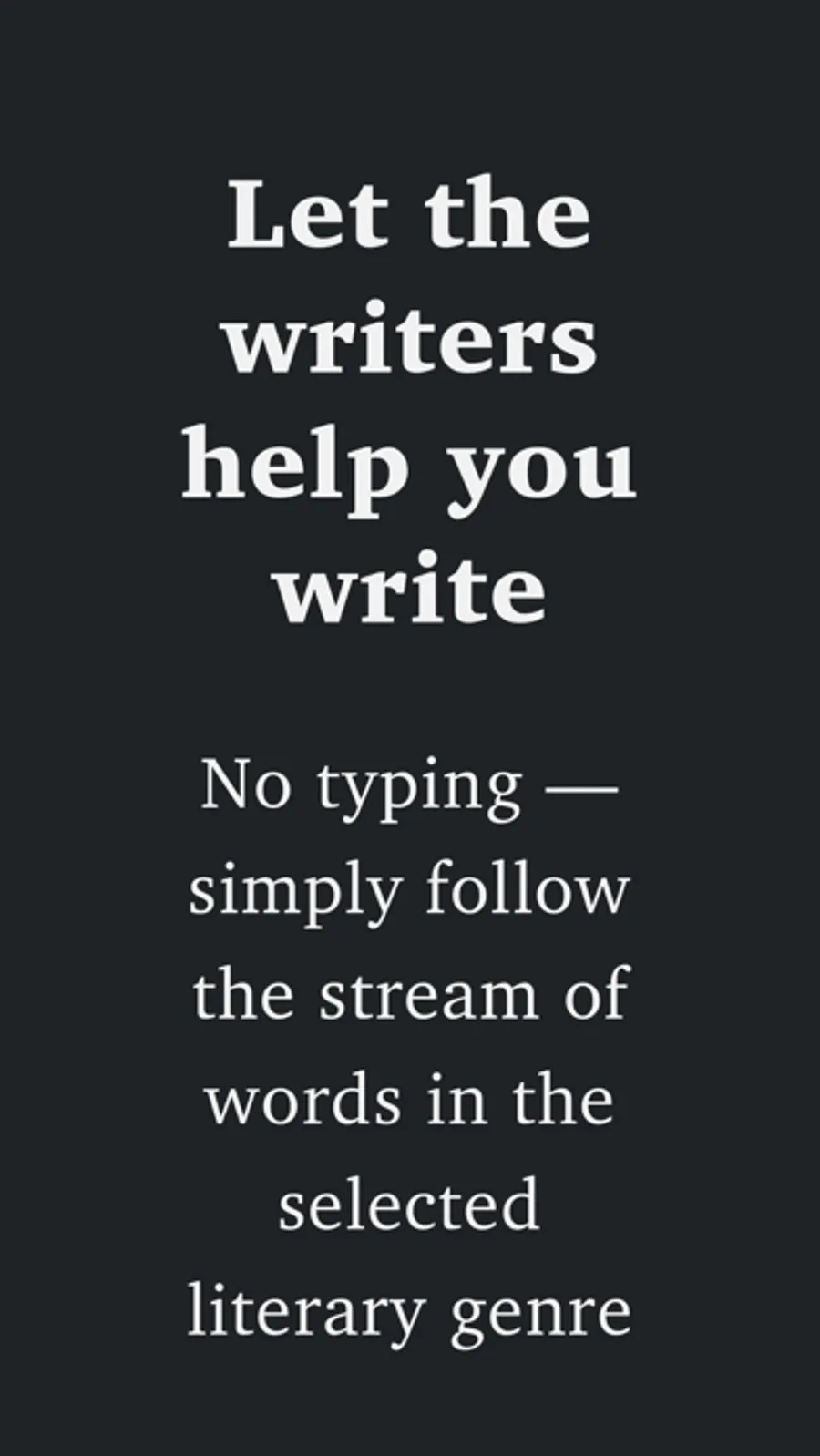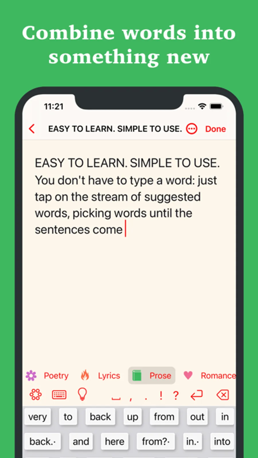 You don't have to type a word: just tap on the stream of suggested words, picking words until the sentences come out. Or combine normal typing with predictive writing. You can easily switch among genres: Poetry, Prose, Classics, Dialogues, Lyrics, You & Me, Cooking, Quotations and Romance.