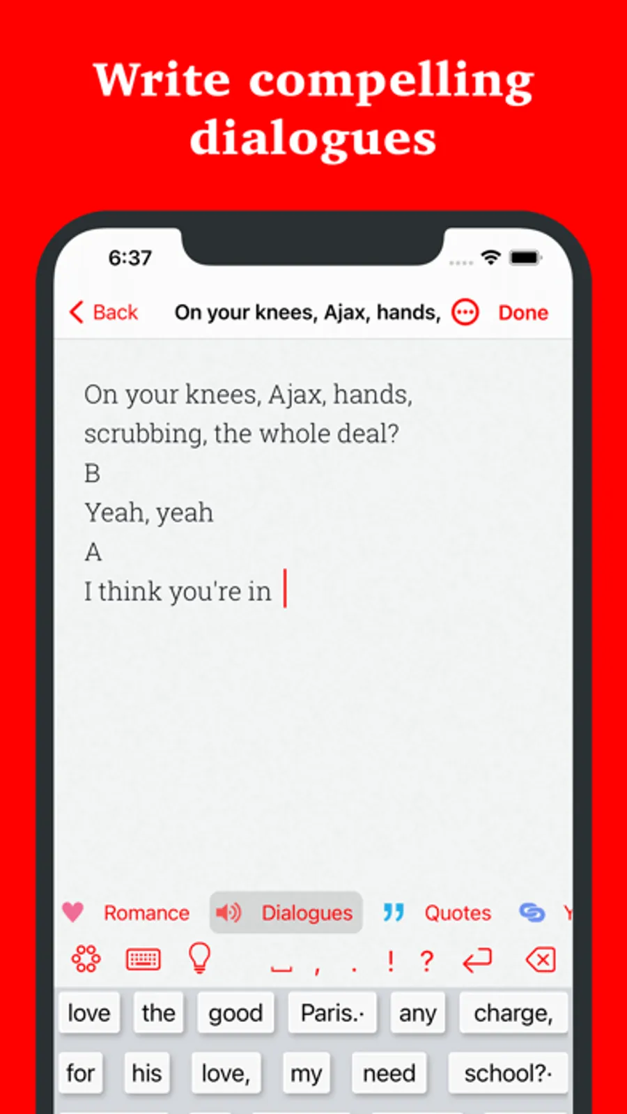 An endless source of writing ideas, words, prompts and sentences for your writing sessions. Millions of text segments analyzed and clustered into 7 powerful predictive models: Prose (best-selling novels), Dialogues (movies, TV series), You & Me, Lyrics (popular songs, RAP), Romance, Classics (Shakespeare, Goethe, Joyce, Kafka, Proust, Dostojevski, and others) and Quotations.