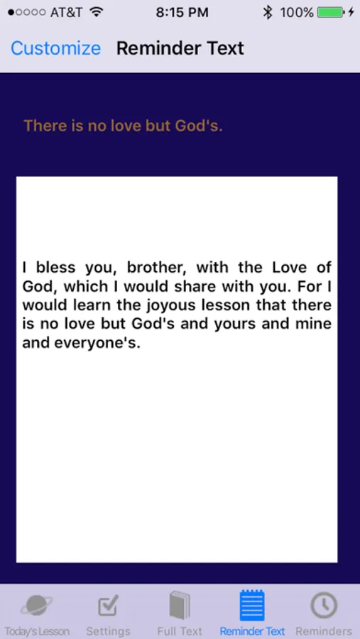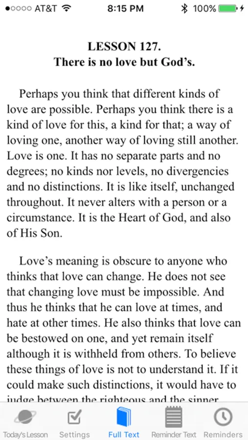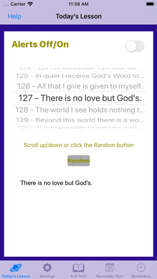 In addition to providing convenient access to the full text of the 365 daily lessons from the Course's "Workbook for Students," THIS APP HAS BUILT-IN REMINDER ALERTS which have been preset with specific text to be remembered for the day and the time intervals as suggested within the lessons of the Workbook. For lessons that have no suggested time intervals, you can select a time interval of your choice. You can even override Course specified intervals to time intervals of your choice that fit in with your daily schedule. The app is simple to use. To begin you would select the lesson you are currently working on from a rotating "wheel," then when the wheel stops on your lesson of the day you click on "Full Text" and you are presented with the full text of the lesson. Once your beginning lesson has been selected you will be presented with the same lesson when you return the next day. This allows you review the previous lesson, or move on to your daily lesson. The complete Workbook, including Introductions, can be accessed from the wheel. During the day, shortened text (the words suggested within the Workbook lesson to be used as the reminder that day) is presented when the reminder alert is sounded. These words can be changed to whatever words you would prefer to use instead. In addition, you can choose what sound you’d like to hear as a reminder, when you want the reminder to start, and when you want it to end.
