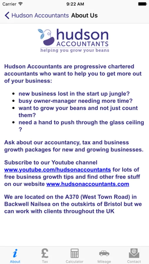 This app is brought to you and your business compliments of Hudson Accountants - Chartered Accountants based in Backwell, Bristol , and is developed by Tax Apps Limited.