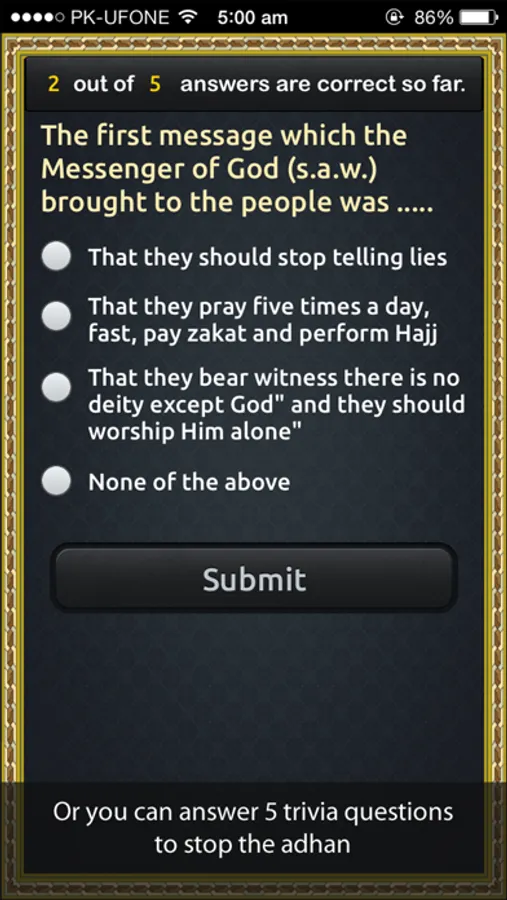 1. Trivia: if you choose this option you will have to answer 5 islam-related questions correctly before the adhan shuts off.