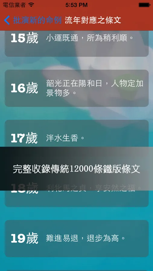 ◆可演算虛歲從十一歲至八十歲(四十歲之後的條文可通過內購獲得);