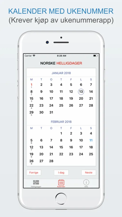 Dessverre er det ikke mulig å gi helligdagene røde prikker i kalenderen på iPhone, men appen inneholder en helligdagskalender hvor dagene vises med rødt og gir mer informasjon når du trykker på dem.