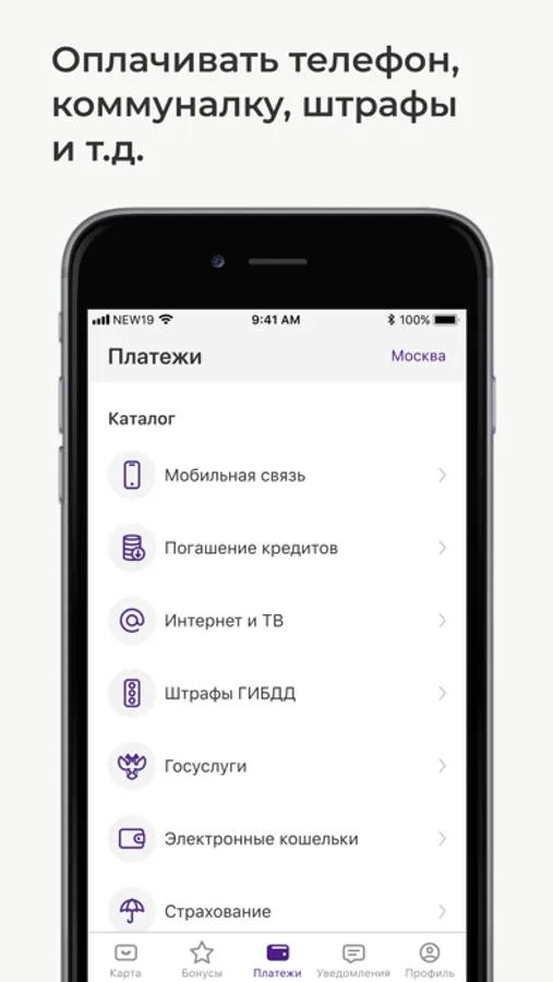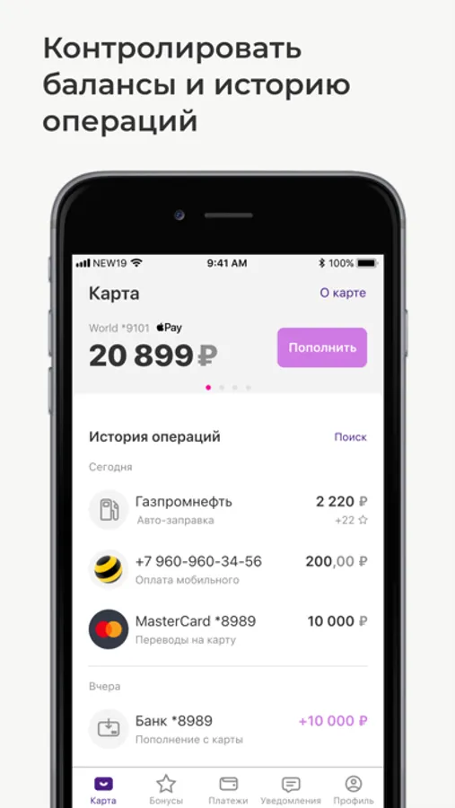 - полноценный on-line банкинг (пополнение карты, блокировка карты, денежные переводы, платежи, оплата штрафов, ЖКХ и т.д.);