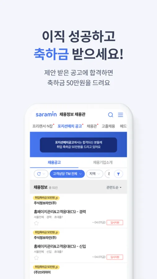- 이직 성공하고 축하금도 획득! 합격ㅋㅋ 채용공고로 합격되신 분들에게는 취업 축하금 50만원을 드립니다.