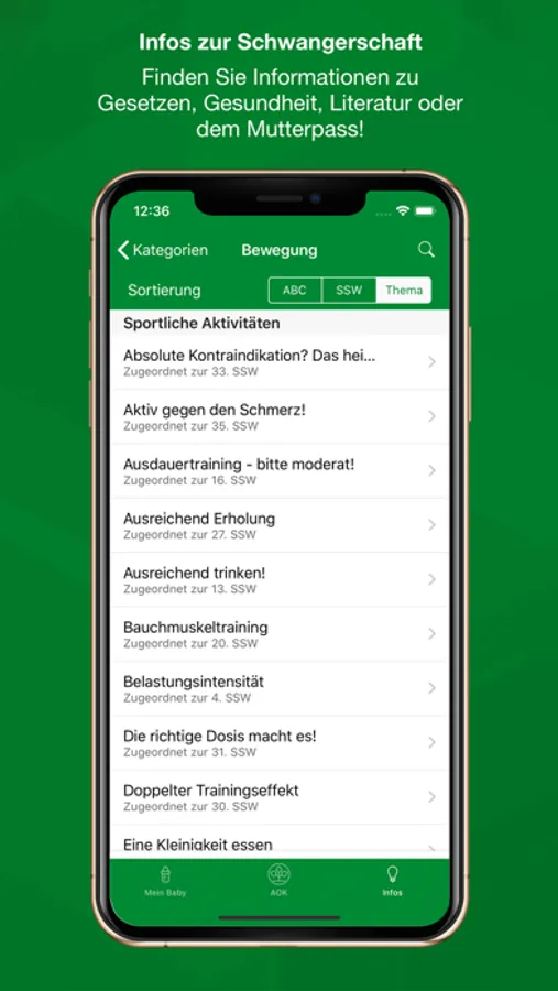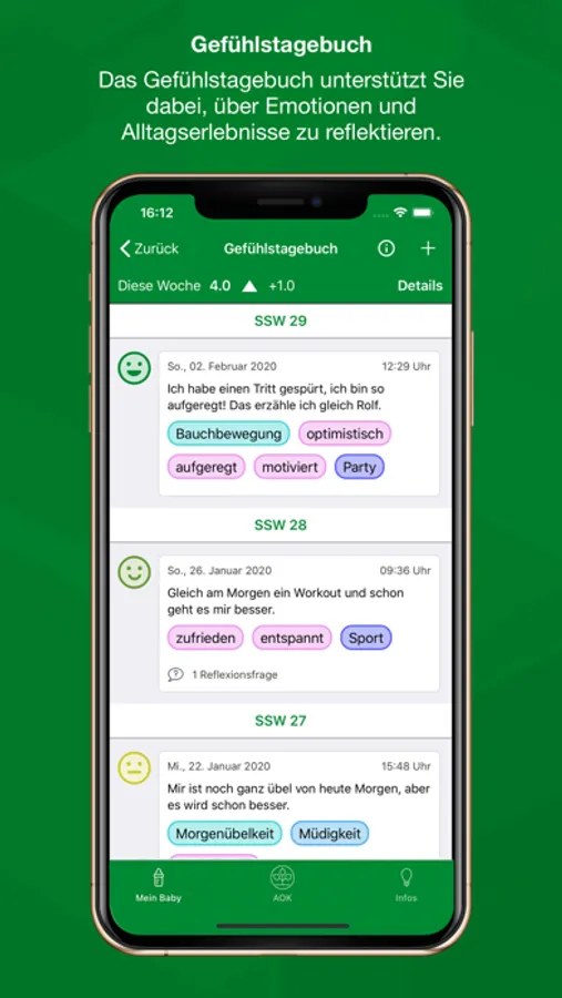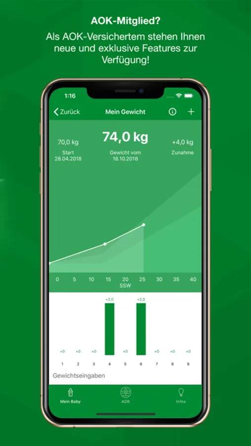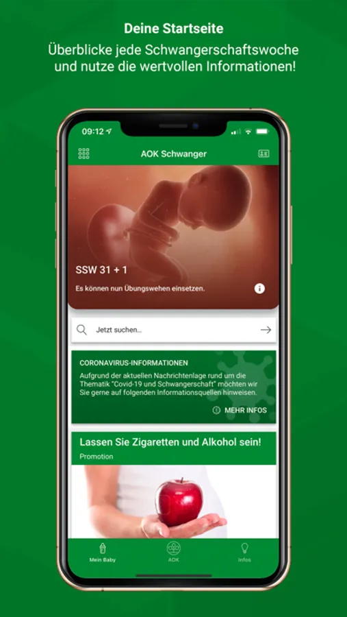 Die Antworten finden Sie in unserer kostenlosen App „AOK Schwanger“. Das bietet die App: