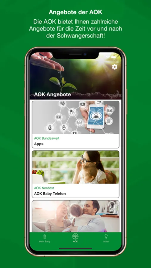 • Verweise auf bundesweite und landesweite Angebote der AOK – speziell für die Schwangerschaft, dazu gehört z.B. das AOK Gesundheitskonto der AOK Nordost – Die Gesundheitskasse.