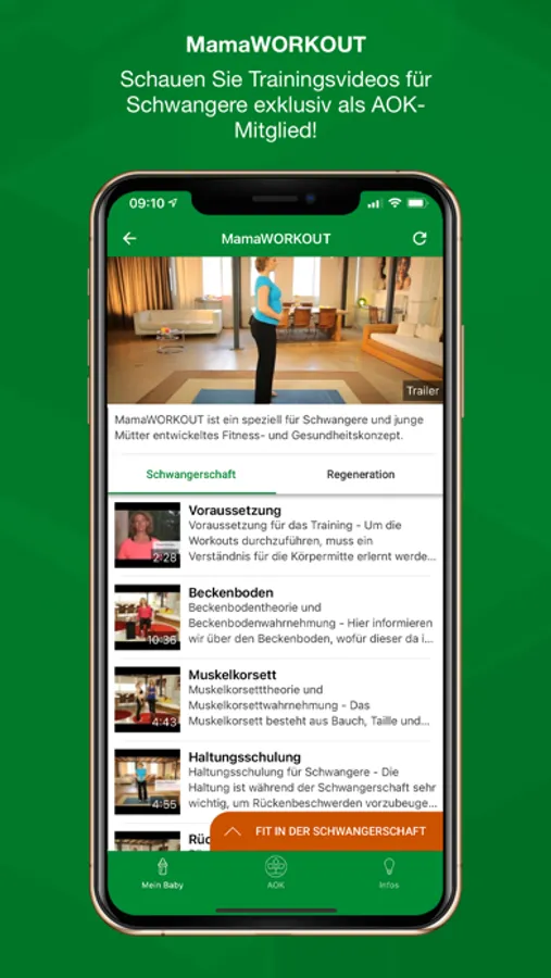 • Ein videobasiertes Training von MamaWORKOUT, das auf die Schwangerschaft abgestimmt ist. Es hilft Schwangeren, fit zu bleiben und sich wohl zu fühlen. Nahrhafte, gesunde und schnelle Rezepte - abgestimmt auf die Schwangerschaftswochen - können einfach nachgekocht werden. Kochvideos helfen dabei.
