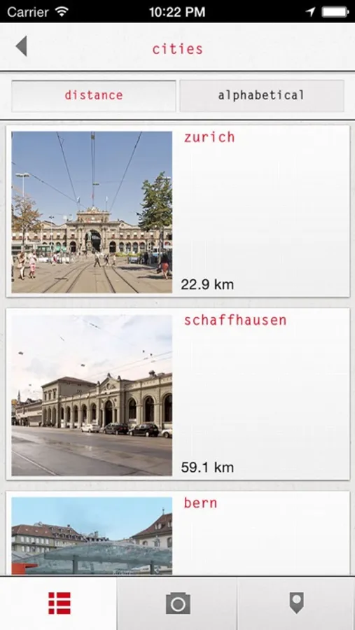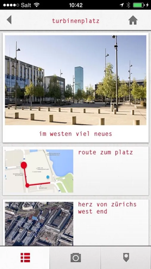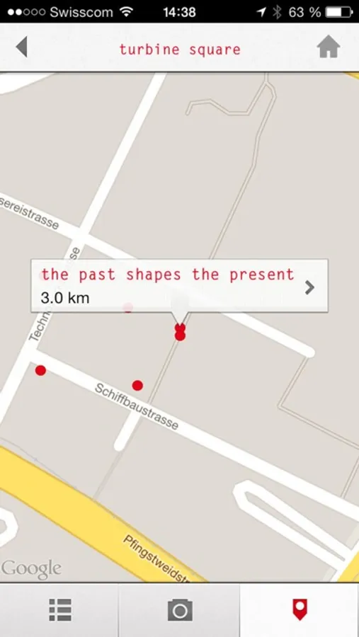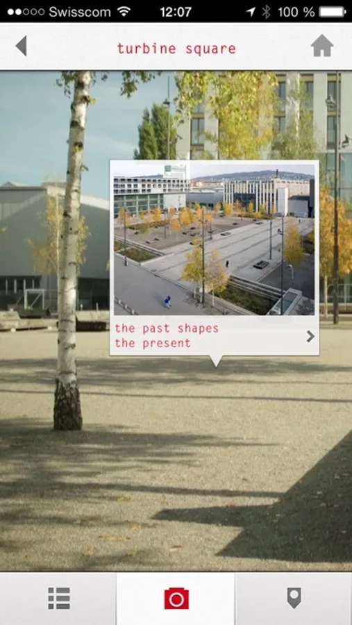Swiss Squares is organised by cities and squares. To ensure good orientation, the app offers three views at each level: List, Augmented Reality and Map. At the centre of Swiss Squares is the individual square in all its different facets.