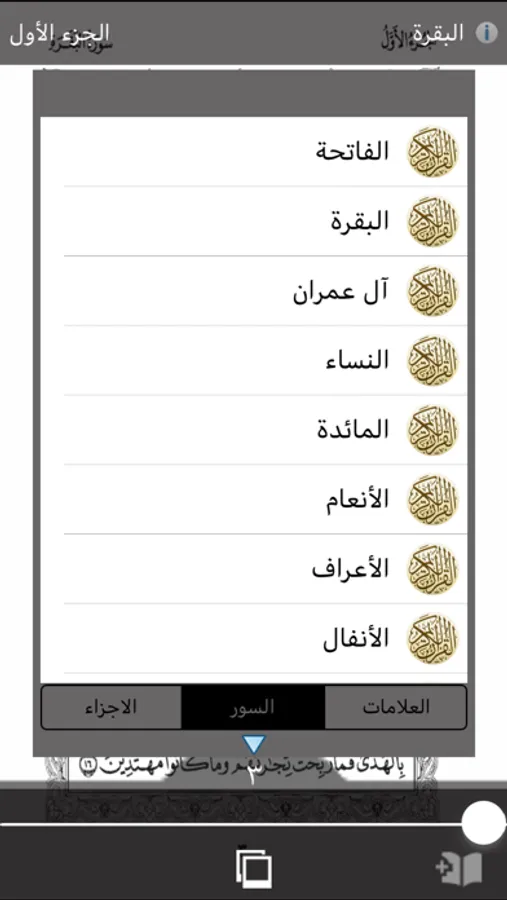إمكانية الوصول للسورة او الجزء المراد بالاختيار من القائمة