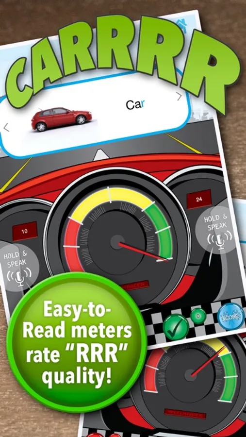 Speech Racer Lite analyzes biofeedback through speech sounds. It measures the quality of the “R” sound in words and shows the user the quality of the “R” sound on one of the racing-themed “R” meters.