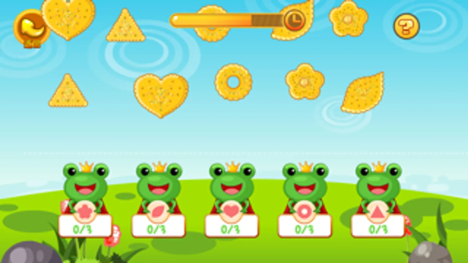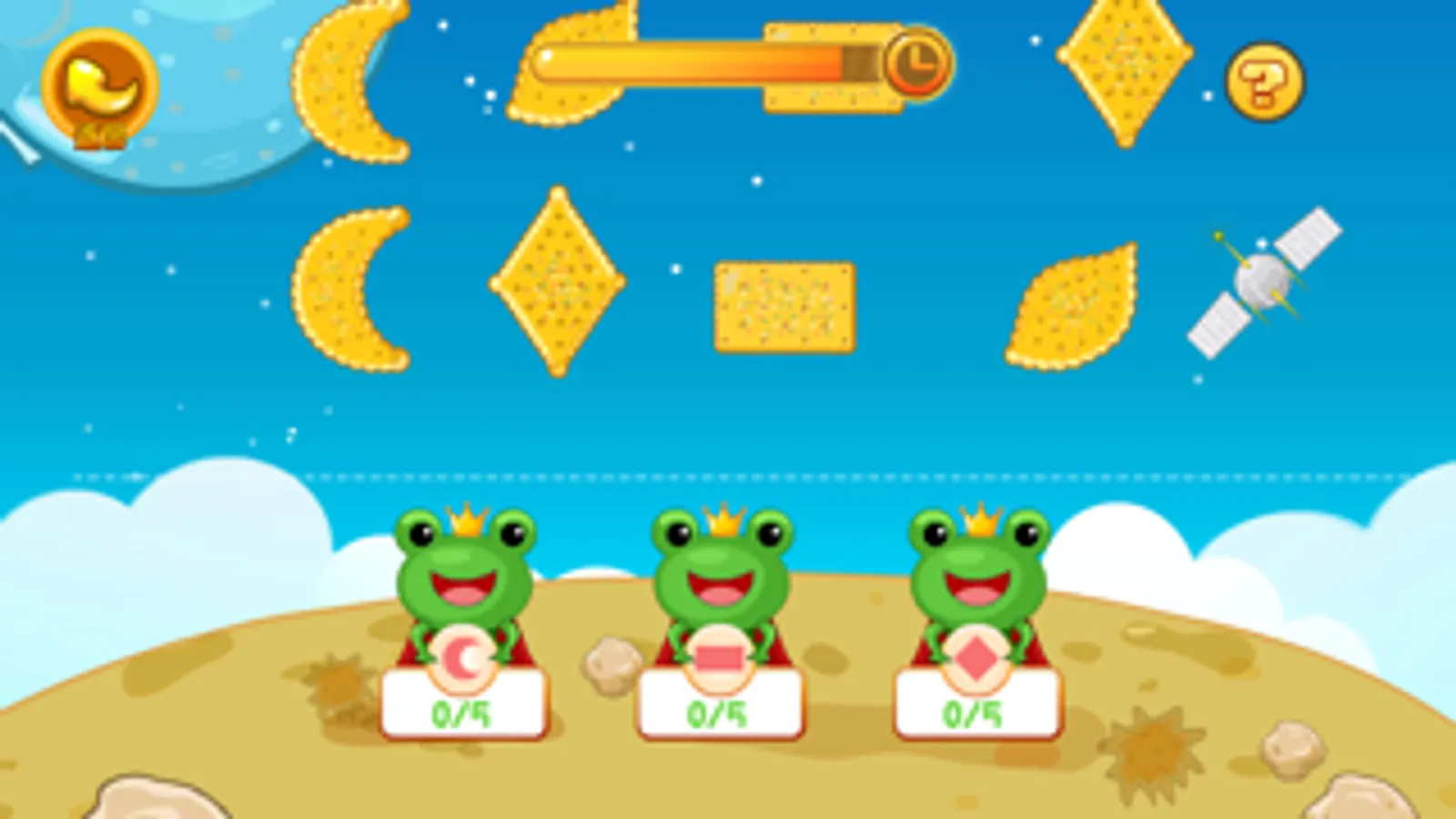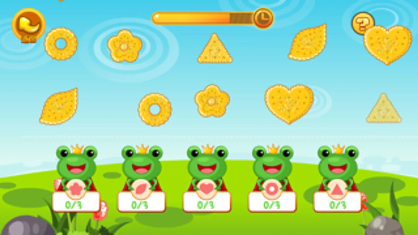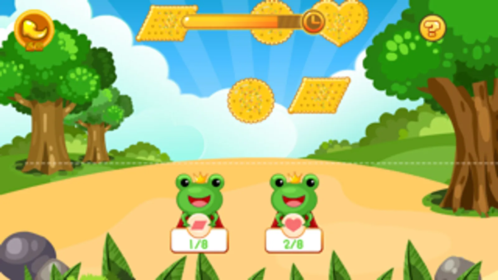 这个小游戏主要锻炼小朋友对图形的认知能力,根据青蛙的要求选择相应的饼干,从辨别两个图形逐渐增加到辨别五个图形,随着游戏级别递增,难度会不断增加哦~