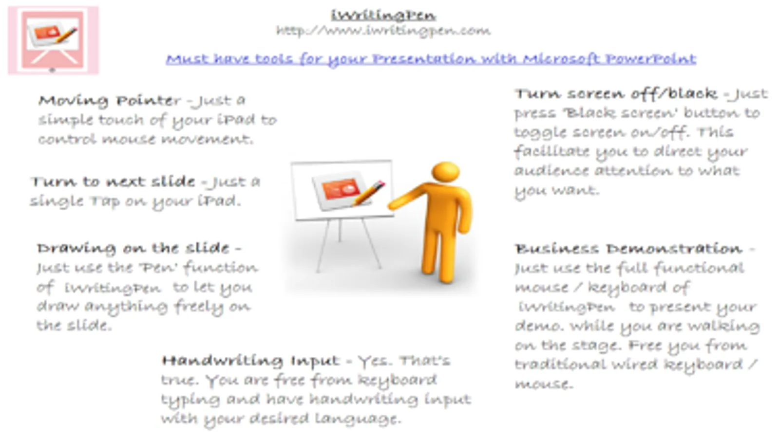 iWritingPen helps you manage Microsoft PowerPoint presentation. With iWritingPen, you are guaranteed a smooth and efficient presentation.