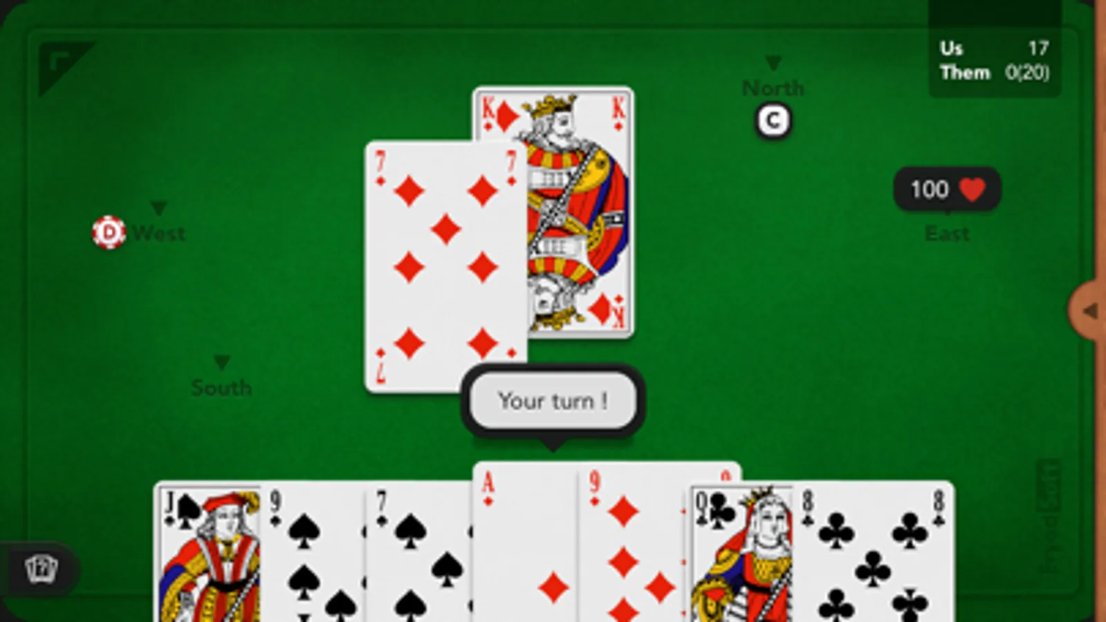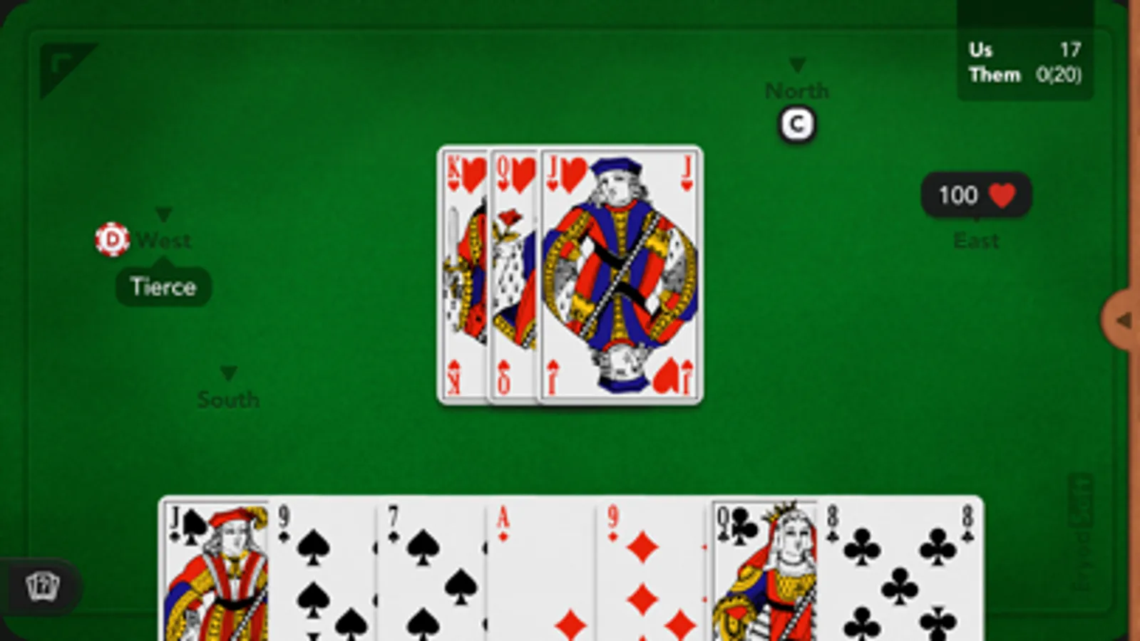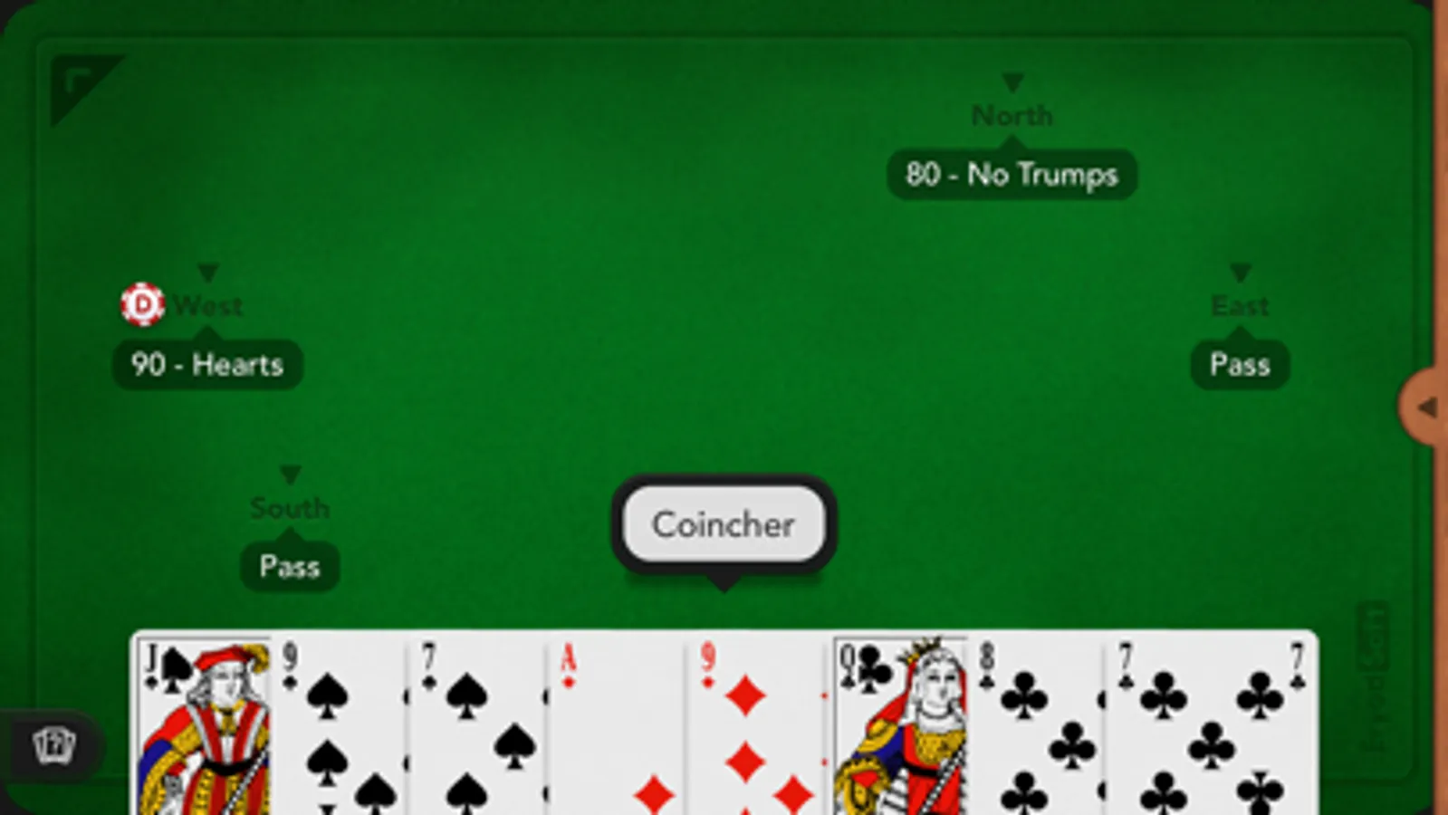 Play to the popular French Coinche card game, also named Belote Contree or Belote Coinchee against opponents simulated by an high-level artificial intelligence, or with your friends.