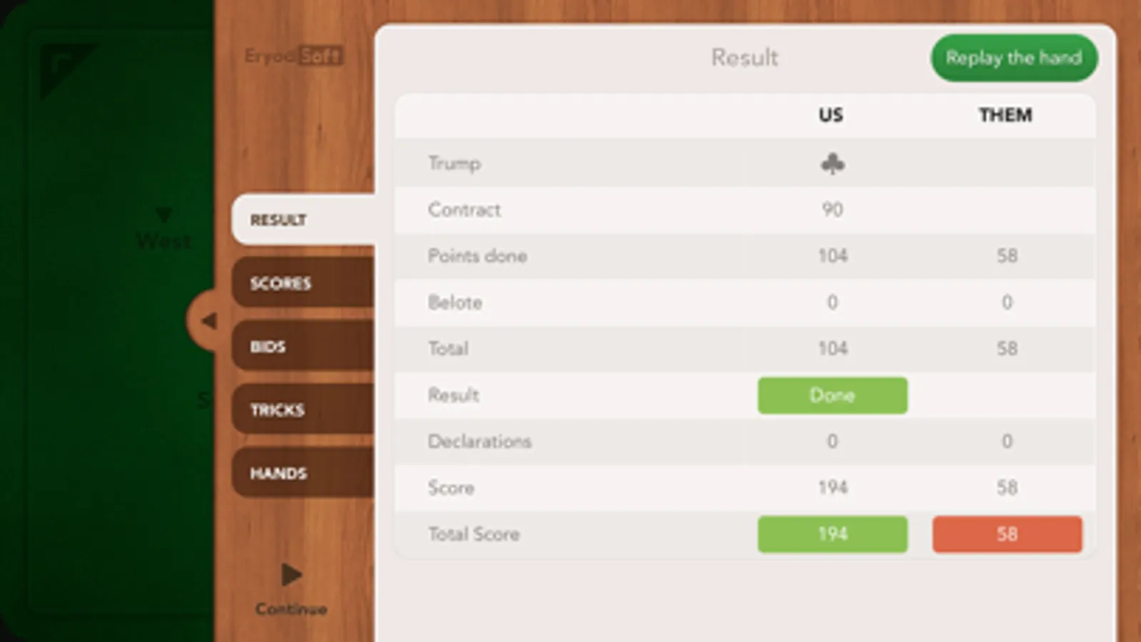 Finally, you can at the end of the round see all the tricks, and replay the round if you want, to train and try new strategies.