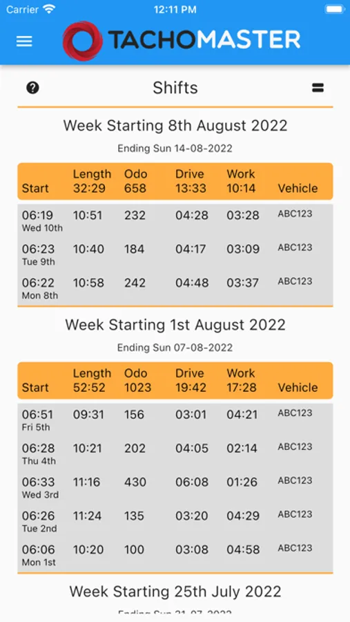* View recent Shifts including Start time, duration, activity totals and vehicle