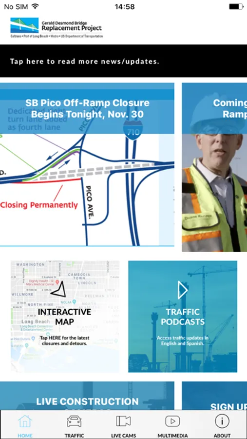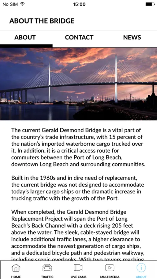 The Gerald Desmond Bridge Replacement Project is creating a new, iconic bridge in the City of Long Beach, and we want you to stay connected! Through our free mobile app, you can get live traffic and detour maps, text alerts, weekly English and Spanish audio reports, photos, videos, access to tour sign-ups and live webcams, and more.