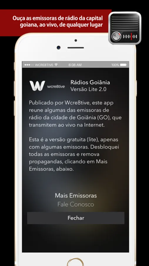O aplicativo é gratuito e permite que você sintonize a sua estação de rádio favorita, onde que que você esteja. A versão Lite exibe apenas algumas emissoras. Se deseja ouvir todas as emissoras de Goiânia e cidades vizinhas, adquira a versão PRO. Além de ter acesso a diversas rádios, você remove as propagandas do aplicativo.