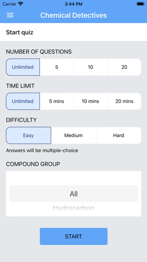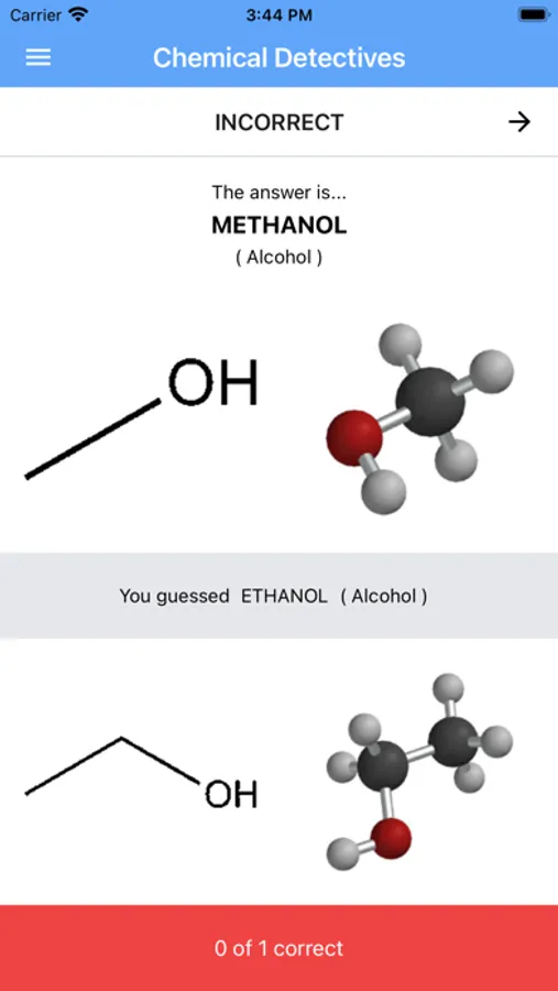 In Chemical Detectives you can set up a challenge between classmates and friends. Set the timer, and the number of problems, then GO! You can also choose from easy, medium or hard, which toggles between multiple choice and full text-entry, which is the best way to master your naming skills. Maybe even challenge your teachers!
