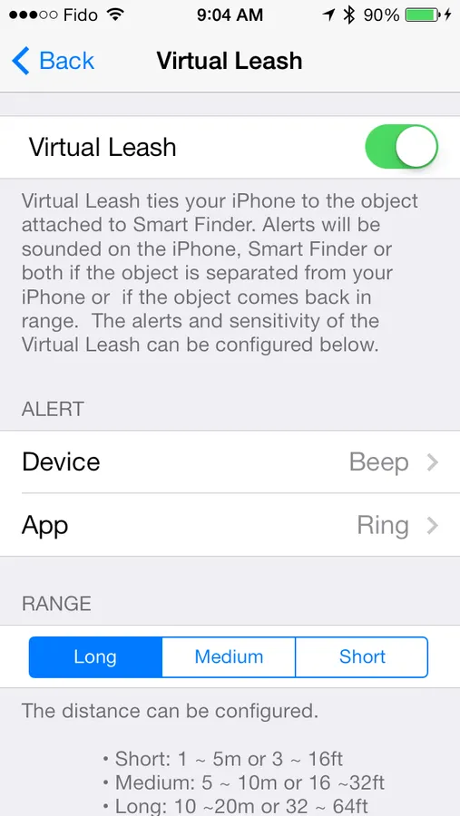 The Virtual Leash function ties your Smart Finder tag attached object to your iPhone. Alerts will be sounded if the two are separated at a distance on the iPhone, the Smart Finder tag or both. The Virtual Leash is perfect in situations such as keeping any eye on your valuables when traveling or to keep track of your kids or pets from wondering off.
