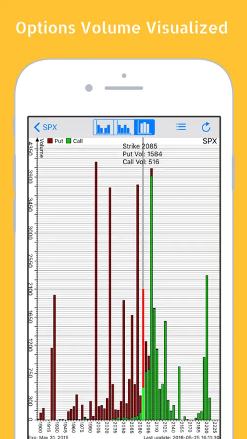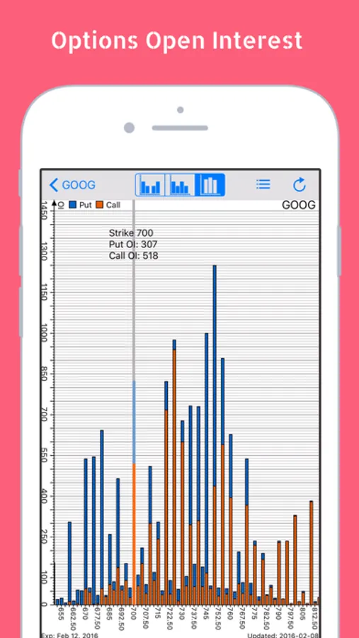 OI app uses a visualized way to present options OI, Volume, and Max Pain in various chart styles. Users can check open interest, volume, and max pain of US market stocks (with options) for each expiration date. Navigating through different expiration dates is extremely easy by simply tapping the left or right arrow (to switch between expiration dates). The strike, Call / Put OI, Volume, Max Pain are displayed by tapping and holding on the chart. OI data are updated daily.