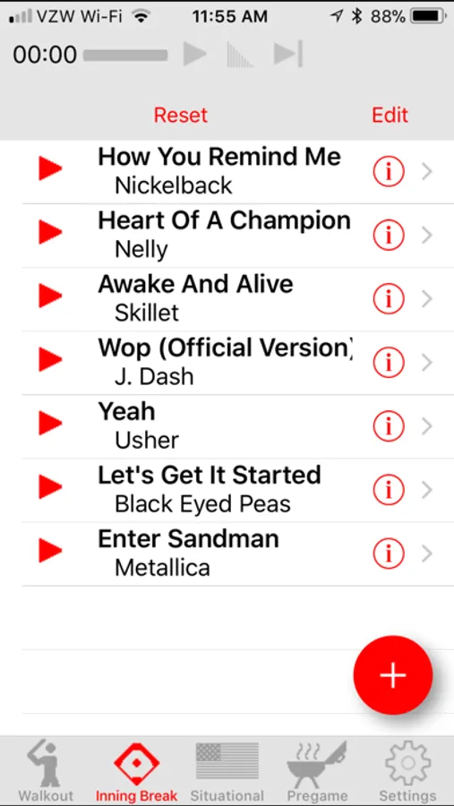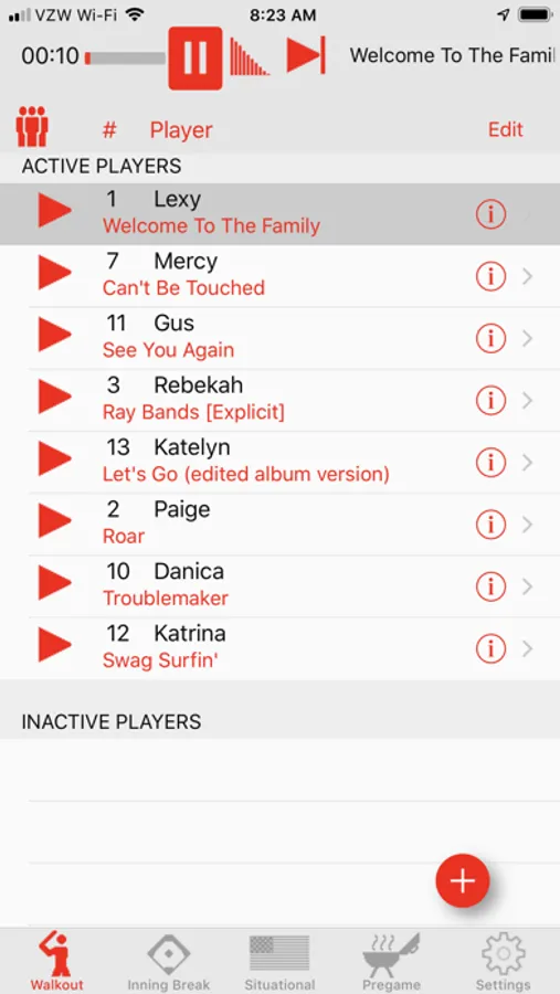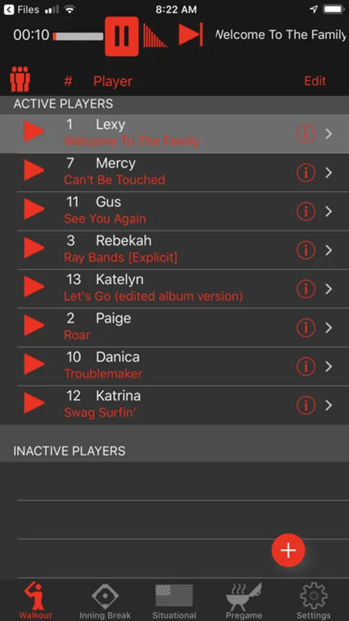 Walkout song DJ makes the difficult task of playing a walkout song for each individual batter as easy as tapping a button. Simply enter the player name and number then select a song from your iTunes library. The precise segment from that walkout song can then be set by selecting a position and playback duration using a simple and precise editing view. Press the play button and 11 seconds later you have one pumped-up batter, and a song that smoothly fades as the batter steps up to the plate. You can also choose between imported, recorded, or computerized text-to-speech announcements for your players before, after, or mixed with their walkout song.