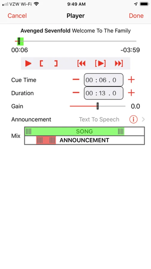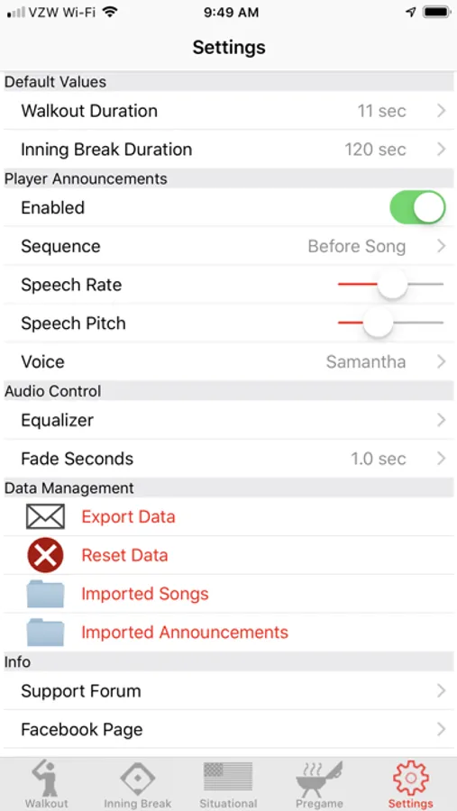 The game doesn’t stop between innings so why should the music? Walkout Song DJ has a view dedicated to inning break songs. Just as before, select a song from your iTunes library and set a position and duration. Since inning breaks are usually two minutes long and most songs are over three minutes, Walkout Song DJ can automatically fade the song out before the start of play. That allows the human DJ to take a break or get a hot dog, and not have to worry about the music interrupting the game.