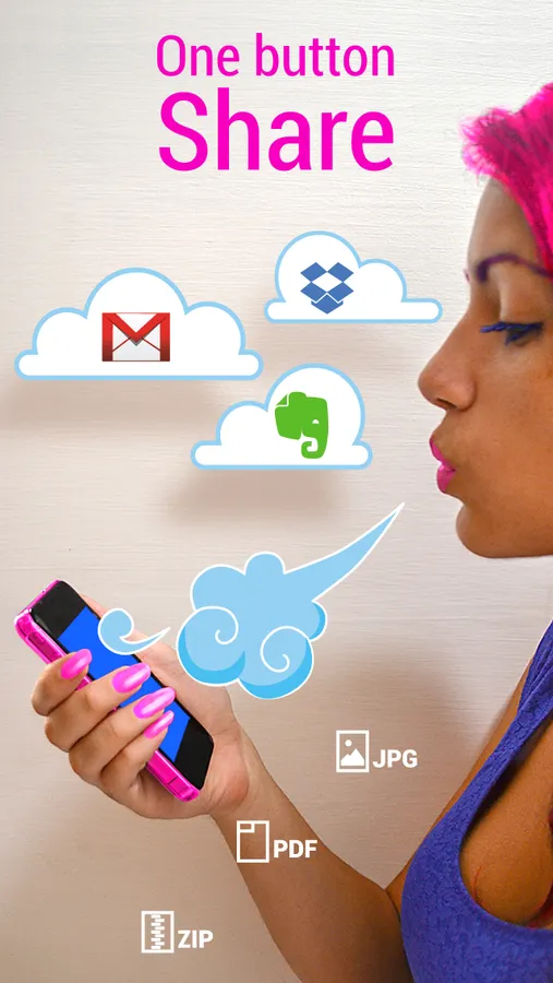 - Upload your documents instantly to Skydrive, Dropbox and more with one touch.