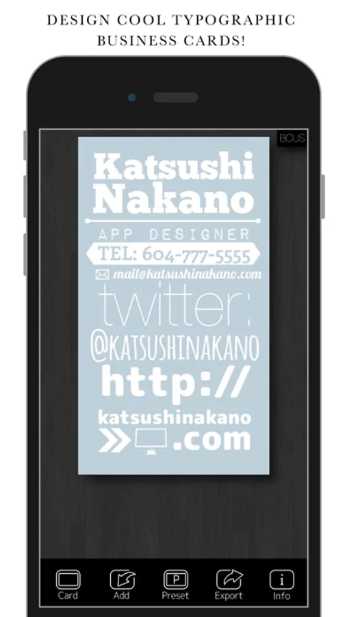 Typography Designer allows you to easily make your cool Typography for iPhone background screenshots, business cards, post cards, posters, and bookmarks! It's very customizable. You can make your own designs and save them as your templates! You can also edit your templates later! You can print, save, and share your design with your friends using Facebook and Twitter!