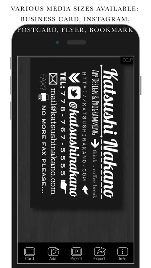 - Supports card sizes for iPhone 4" and 3.5" screen, business card (US 3.5 x 2, Japan 91 x 55mm, China 90 x54mm, Western Europe 85 x 55mm, Eastern Europe 90 x 50mm, 2.5" Square, 2" Square), Post Card(US 6 x 4.25", Japanese Hagaki 148 x 100mm), Poster (Letter, A4), and Bookmark(1-3/8 x 8-1/2)
