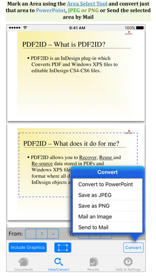 Convert PDF to PowerPoint presentations instantly with a simple tap. Convert the entire document, range of pages or select and mark specific areas in a page to convert using the Area Select tool and have it editable on your iPhone!