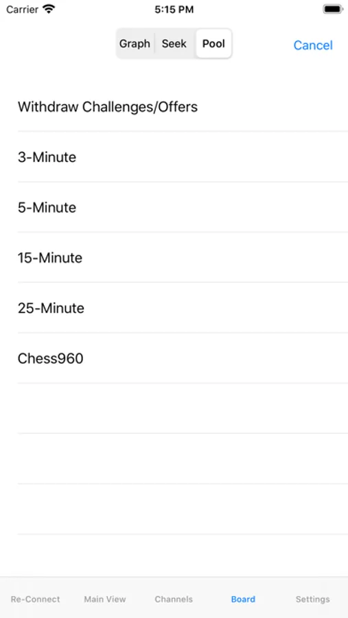 For play, the Find a Game board option opens a three tabbed view with a Seek Graph, Seek Form and Pool Options like 5-minute. Another option is Join Tournaments. Any game type can be played unrated with no signup. Many features are completely free and don't require signup.