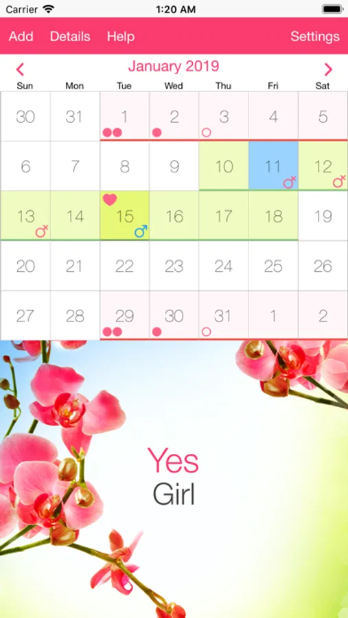 - Average length of the menstrual cycle (adjust it on the “Settings” screen).