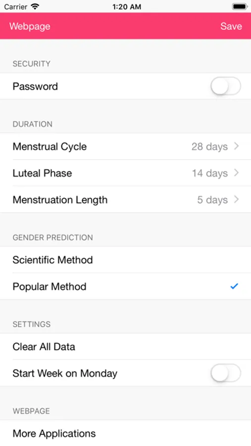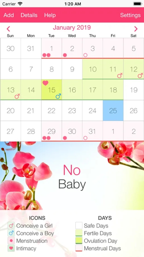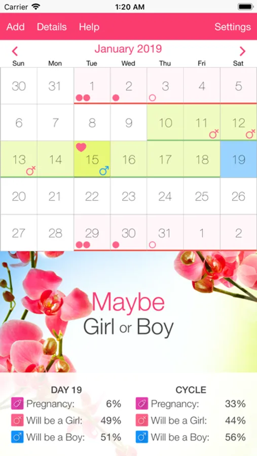 You can change the gender prediction method on the “Settings” screen. But remember that either gender prediction method shows only slightly higher chances of conceiving a girl or a boy and it never guarantees the result.