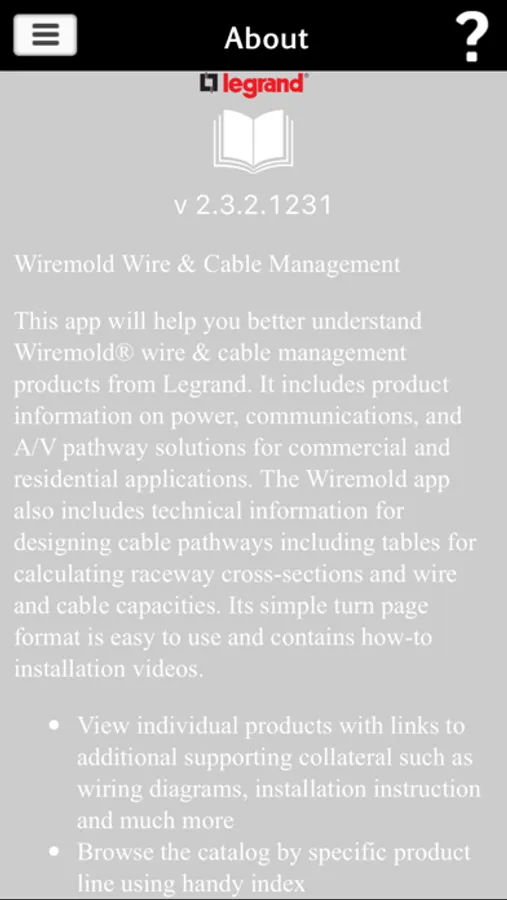 This app will help you better understand Wiremold® wire & cable management products from Legrand. It includes product information on power, communications, and A/V pathway solutions for commercial and residential applications. The Wiremold app also includes technical information for designing cable pathways including tables for calculating raceway cross-sections and wire and cable capacities. Its simple turn page format is easy to use and contains how-to installation videos.