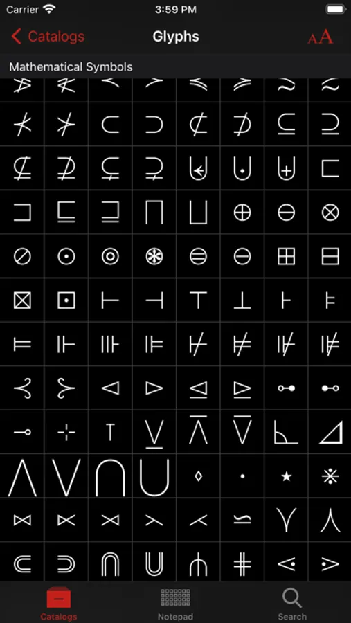 • Huge selection of symbols (thousands), in fact all that are available on your device. Database itself actually contains data for all characters (over 140000!).