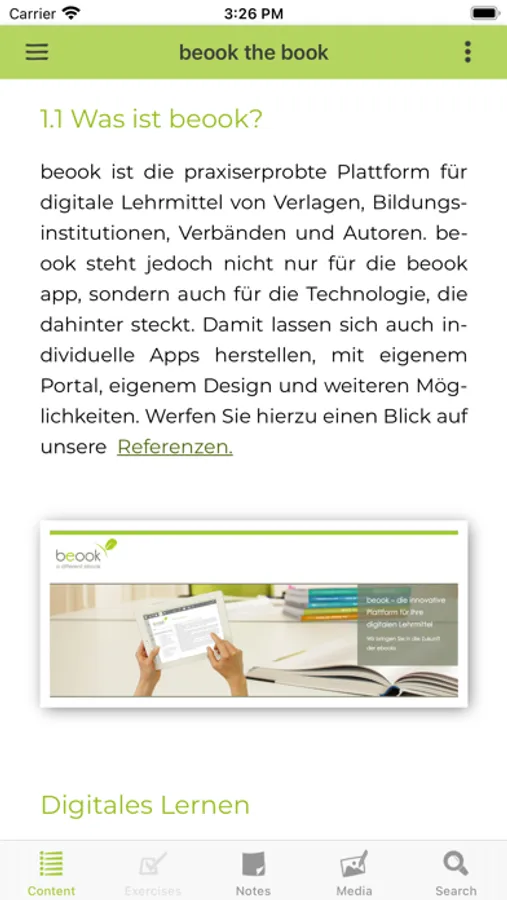 The beook app is a platform for digital teaching material of any kind provided by miscellaneous publishers, educational institutions and authors. Next to the iPad it is also available for Windows, Mac Computer and other tablet operating systems.