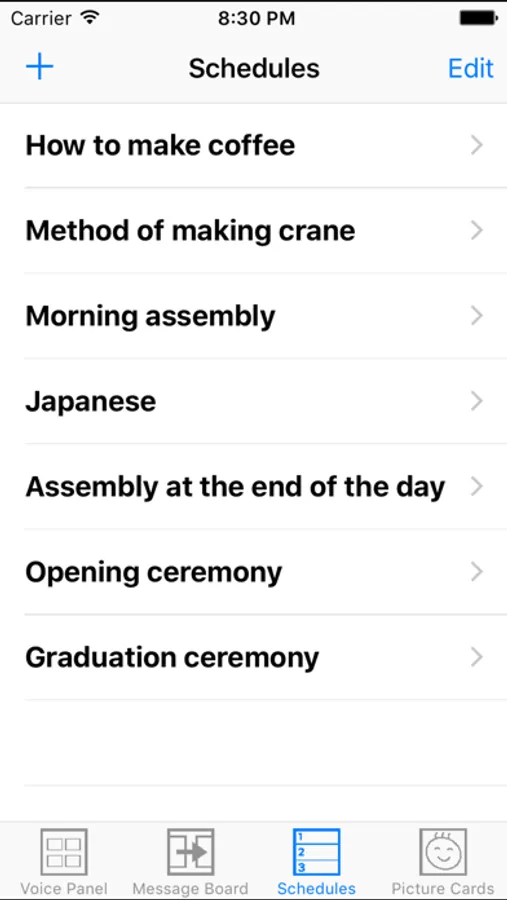 VOCA function, ability to create a sentence using the word , "vocaco" has a display and delete functions of schedule.