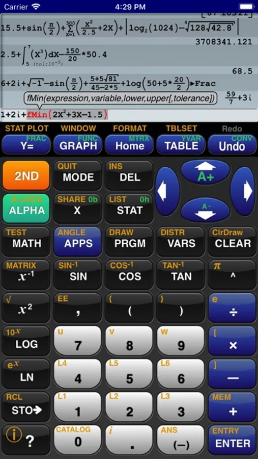 GraphNCalc83 uses touch, color and blazing speed to handle your math problems. The familiar calculator keyboard, arrow keys and functions are enhanced with full touch input for all graphs, editors and menus. Enter calculations in natural textbook format. Enter fractions and view result as fractions. Trace graphs with your finger. Zoom in and out with a pinch. Explore regressions with a tap on the screen. Scroll through the list, matrix and calculation history with a swipe. Tap the ? key for help. Written using the latest 64 bit math libraries, GraphNCalc83 harnesses the amazing computing resources of the iPhone and iPad to provide a colorful, fast and fluid experience. Graphs scroll, glide and zoom smoothly. Matrix, statistics and BASIC programs run 500x times faster than traditional calculators.