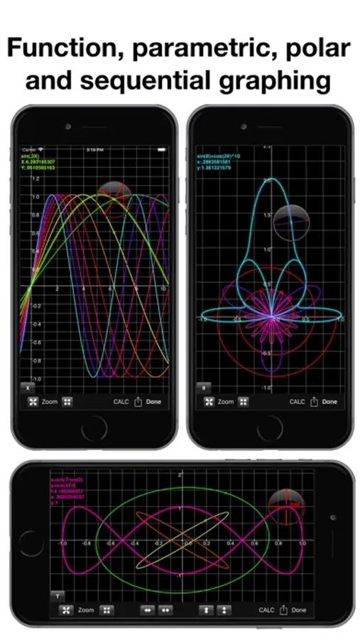 Graph functions, parametric, f(x,y) and polar equations and statistics plots: Full color graphs with touch to trace, pinch zoom, function minimum, maximum, intersections, asymptotes and numeric integration. Output graphs in high resolution PDF format for mailing or printing. Interactively explore function behavior using variables tied to slider bars.
