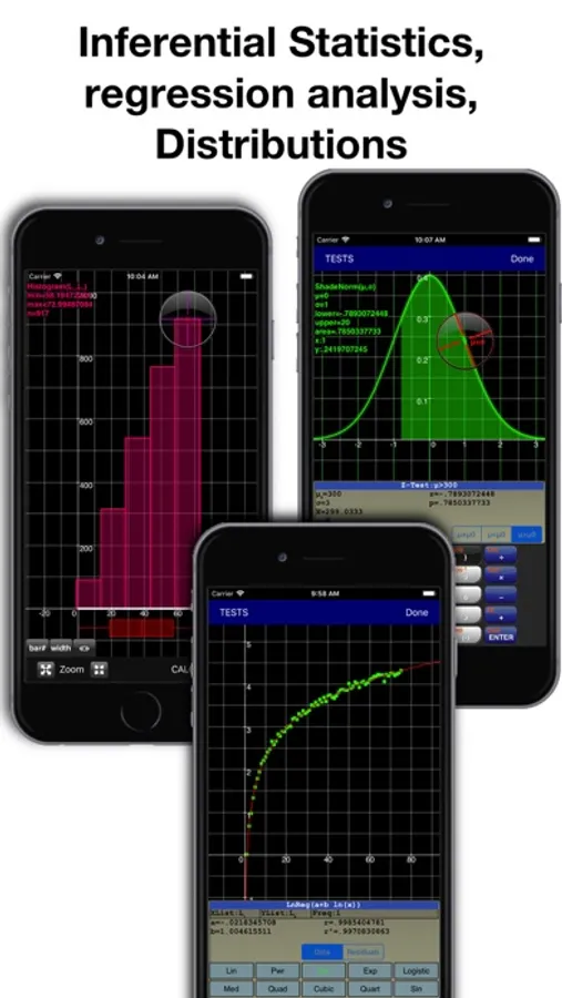 Statistics, Inferential Statistics and Distributions: A set of inferential statistics worksheets and graphs of distributions are included. The regression analysis screen allows you to quickly compute, view and analyze a data set using a variety of curve fitting methods.