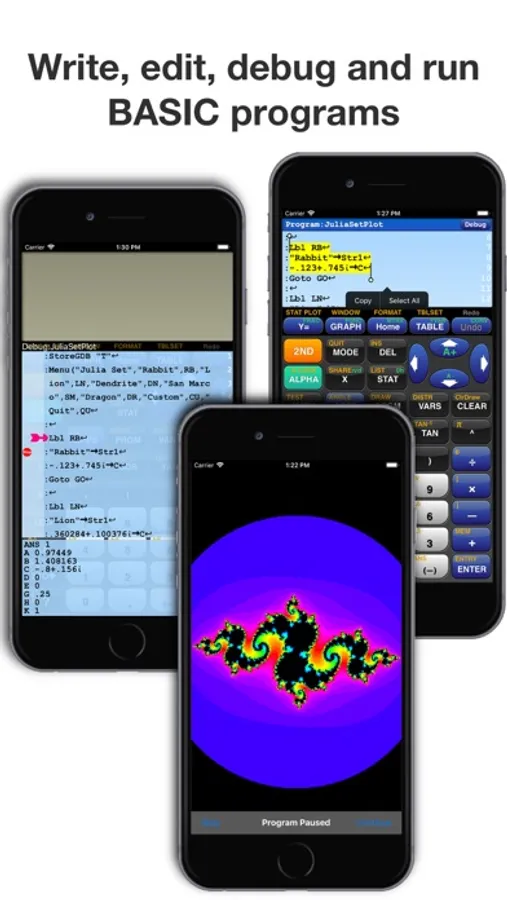 BASIC programming: Create, edit, debug and run BASIC programs. Programs run more than 500 times faster than traditional calculators. Import and execute .83p and .8xp files.