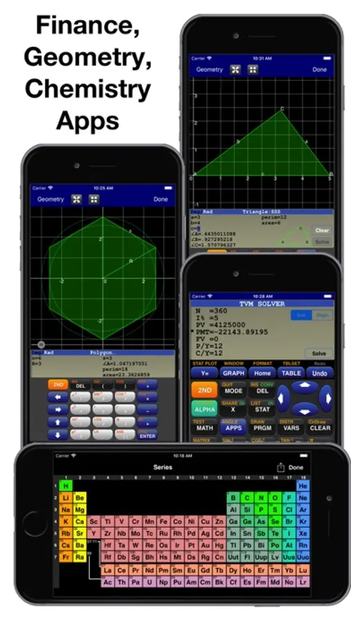Chemistry: The calculator includes a full featured periodic table, a mass calculator and a data base of element properties. The touch interface allows you to view and interact with the periodic table to view by series, state, melting point, boiling point, electronegativity, electron affinity, valence, ionization, radius, hardness, modulus, density, conductivity, heat and year discovered.