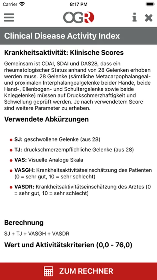 Highlights der App sind u. a. die verschiedenen Score-Rechner (z.B. 2010 ACR/EULAR, CDAI, SDAI, DAS28, RADAI-5, HAQ-DI, ASDAS, BASDAI und BASFI), die übersichtliche Darstellung der Leitlinien zur Therapie der RA, PSA und SPA, Empfehlungen zur Verwendung wichtiger Medikamente bei Kinderwunsch, während der Schwangerschaft und Stillzeit sowie das Thema „Impfen unter Therapie“.